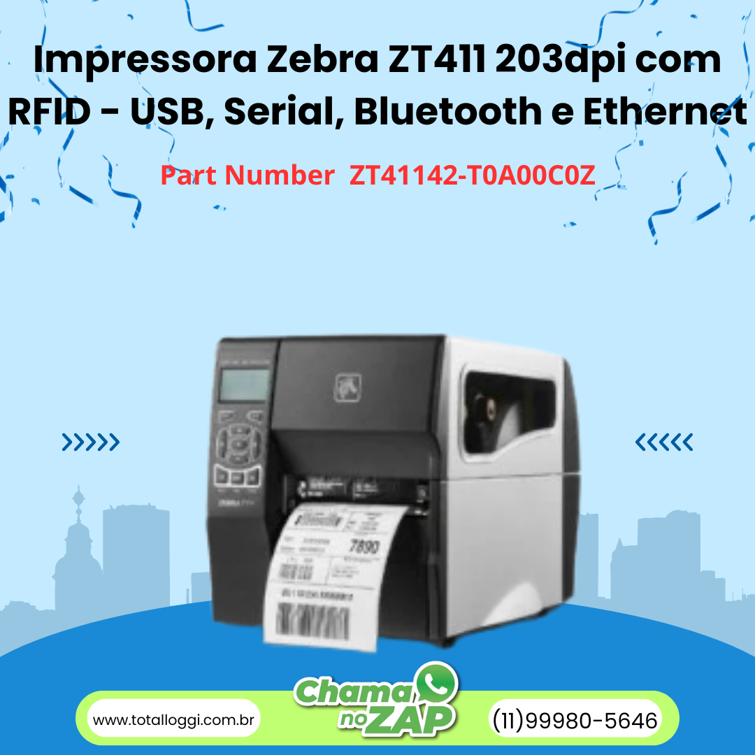 ✔️ Impressora Zebra ZT411 203dpi com RFID – USB, Serial RS232, Bluetooth e Ethernet